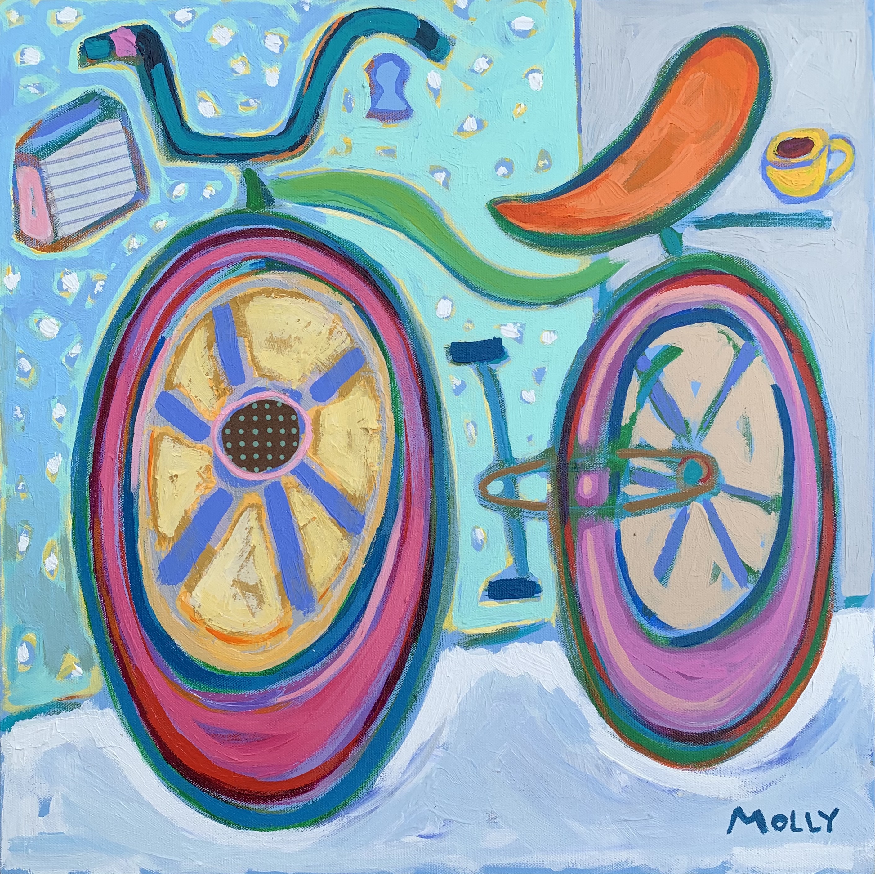 Between 2003 and 2013 I painted 40-50 bike paintings. I wish I could say that the years that my kids were small I was taking photos of my art and keeping organized records of what I made…but I totally wasn’t. I was happily present with my young kids at home and somewhere in a box someplace…probably with lincoln logs and matchbox cars are photos of my bike paintings. Some Bike Paintings were huge and some were small. They just happened in between still life paintings and landscapes. Whenever I had left over paint on a palette I would just start making a bike painting. Yes-my family loves to bike. (Also included are a few new bike paintings from 2018, 2019, 2020 and 2021). Maybe I should aim to continue to make one a year.