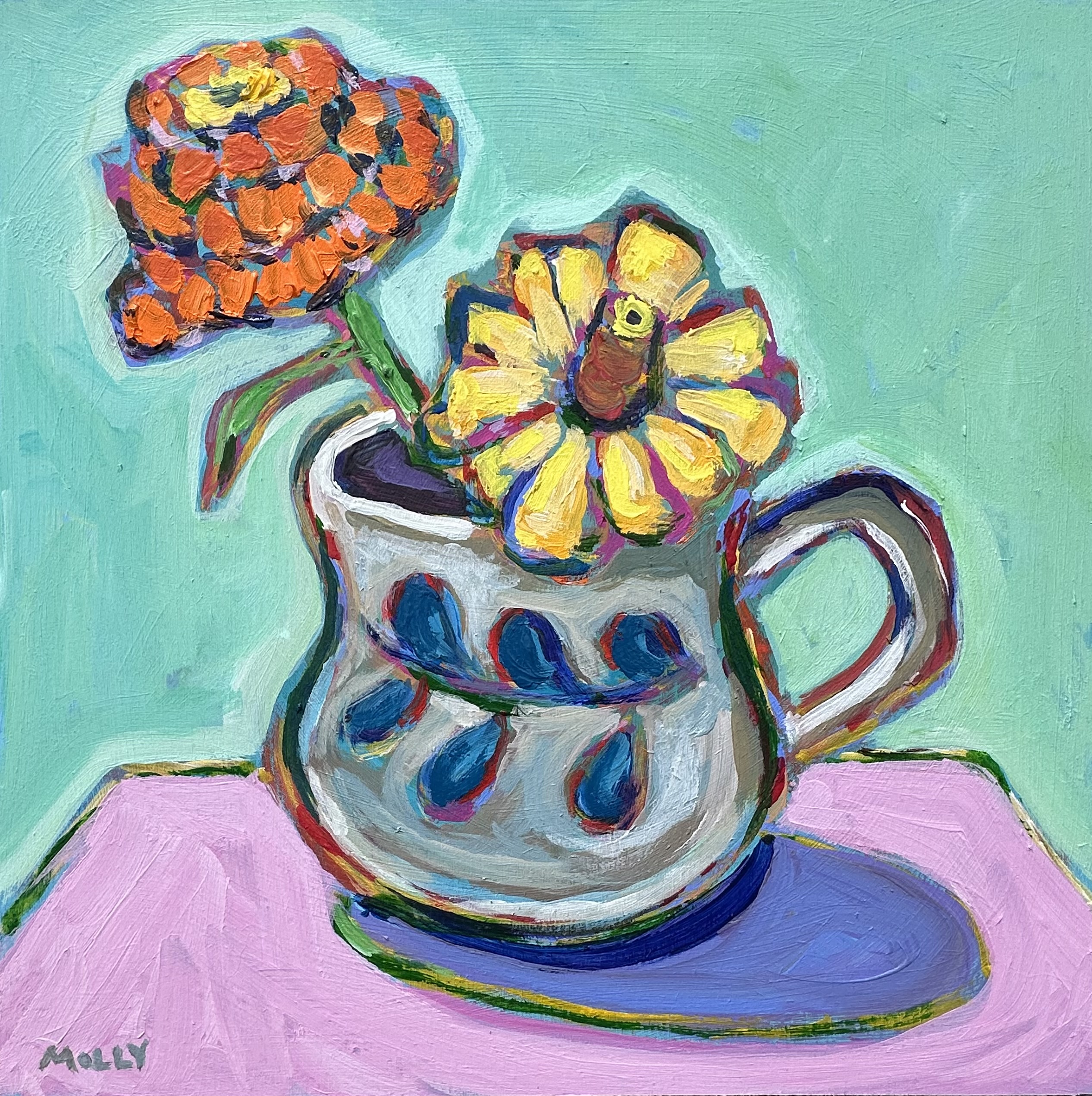 Zinnias, Lemon, and Teapot, 18×18 (sold)